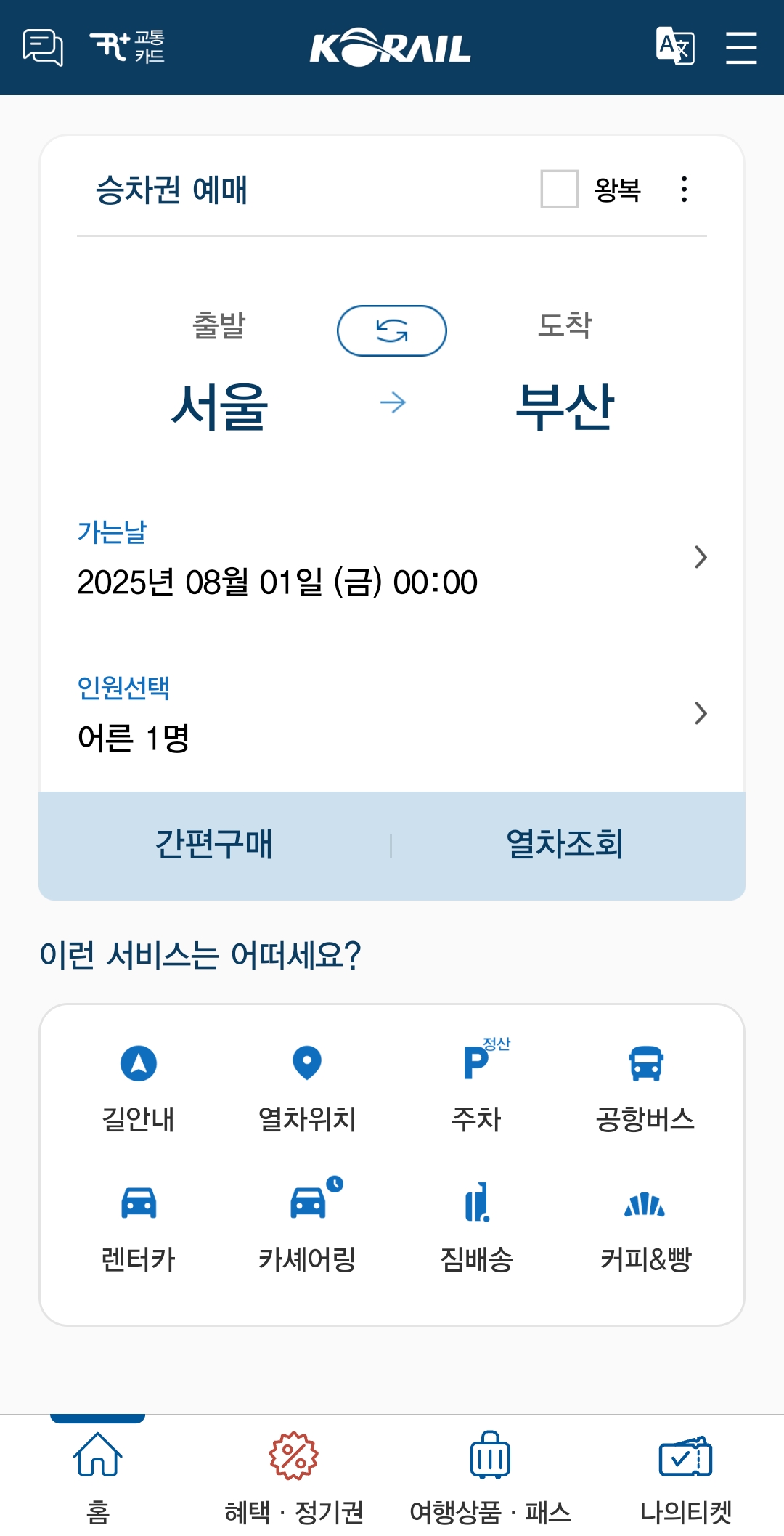 앱을 실행하면 메인 화면에서 승차권 예매를 선택합니다. 출발역과 도착역을 설정하고, 원하는 날짜와 시간을 지정합니다. 서울에서 부산까지의 경우 서울과 부산을 각각 선택하시면 됩니다.