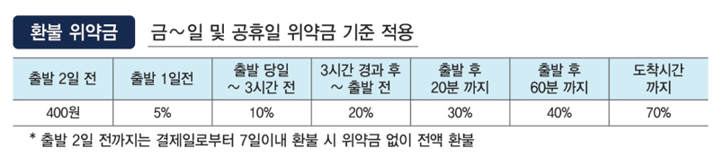 ■ 2025년 추석 KTX 승차권의 환불 위약금 (주말 및 공휴일 기준)은 다음과 같습니다.