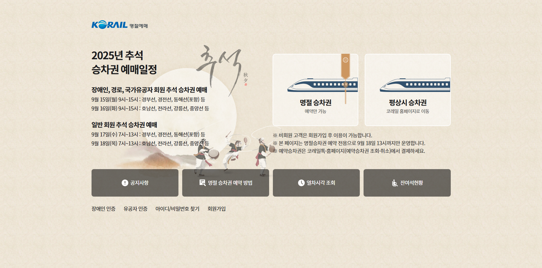 예매는 코레일 멤버십 회원만 가능합니다. 미리 홈페이지에 접속해 회원가입을 완료하고, 로그인 상태를 유지해 두세요. 비회원 예매는 불가능하거나 대기 시간이 길어질 수 있습니다.