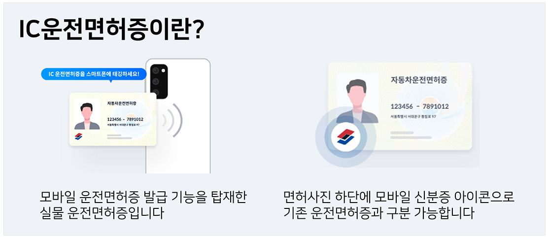 이 방식은 IC칩이 내장된 실물 운전면허증을 발급받아, 이를 스마트폰에 태그하여 모바일 면허증을 발급받는 방법입니다. 스마트폰 교체나 앱 재설치 시에도 실물 IC 카드를 태그하여 재발급이 가능하여 편리합니다.