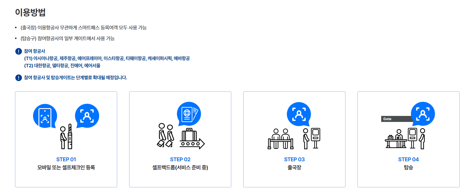 스마트패스는 출국 절차를 간소화하는 안면 인식 시스템일 뿐, 여권과 탑승권을 대체하는 신분증이나 여행 서류가 아닙니다. 공항 및 항공사 정책에 따라 보안 검색 및 탑승 시 직원이 여권 또는 탑승권 제시를 요구할 수 있습니다. 수하물에 넣지 말고, 출국하는 순간까지 여권과 탑승권은 반드시 직접 소지해야 합니다.
