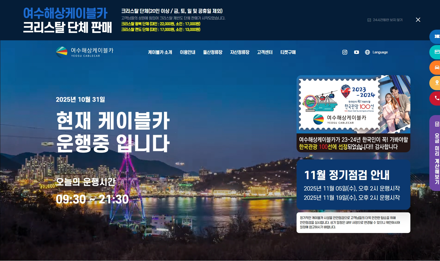 2. 여수 해상케이블카 운행시간 및 정기점검일 확인
