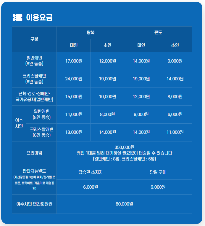 2025년 현재, 여수 해상케이블카의 요금은 캐빈 종류에 따라 명확하게 구분됩니다.