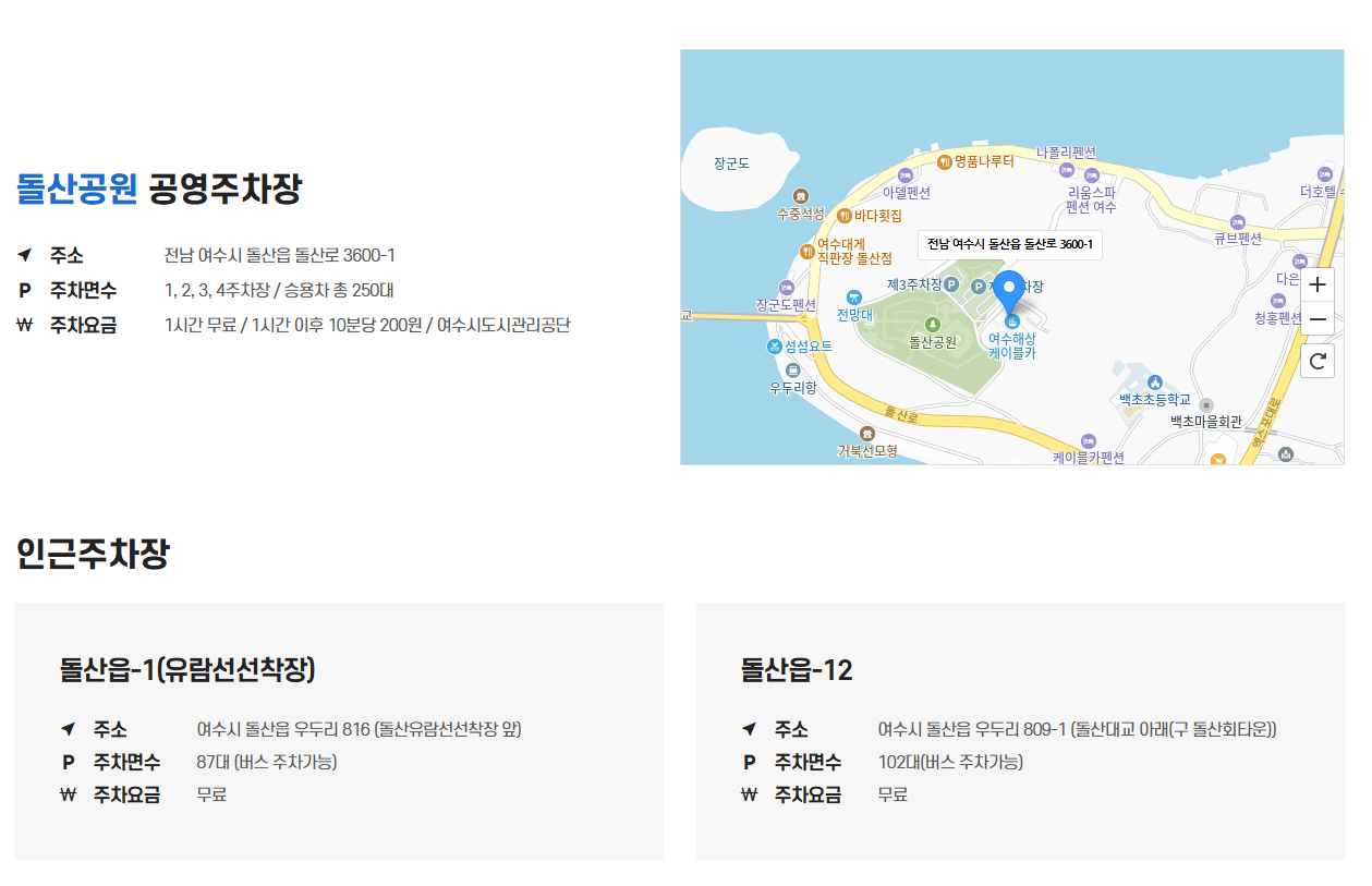 주소는 전라남도 여수시 돌산읍 돌산로 3600-1에 위치하며 돌산공원과 연계되어 있습니다.