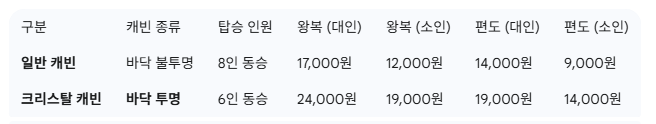 바닥이 강화유리로 되어 있어 짜릿함을 더하는 크리스탈 캐빈(6인 동승)은 일반 캐빈보다 가격이 높습니다. 왕복 기준 대인은 24,000원, 소인은 19,000원이며, 편도 요금은 대인 19,000원, 소인 14,000원입니다.