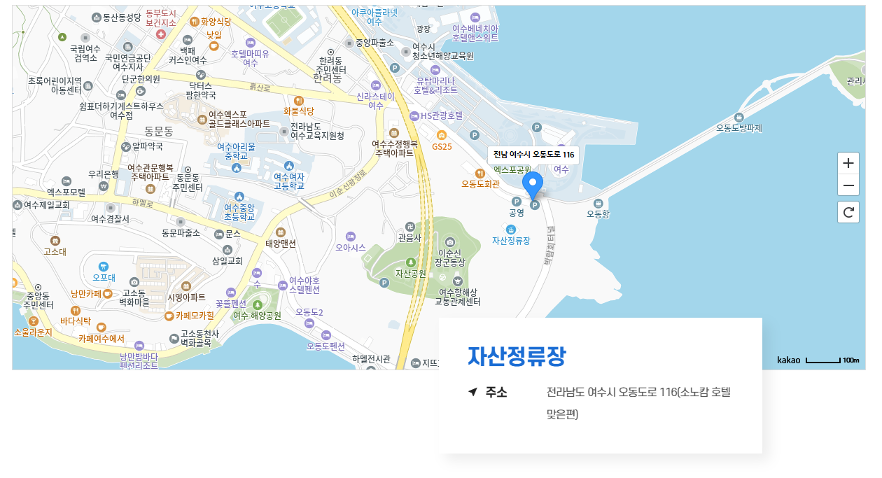 주소는 전라남도 여수시 자산4길 7이며, 오동도와 여수 엑스포장과 가까운 육지 쪽에 위치해 있습니다.